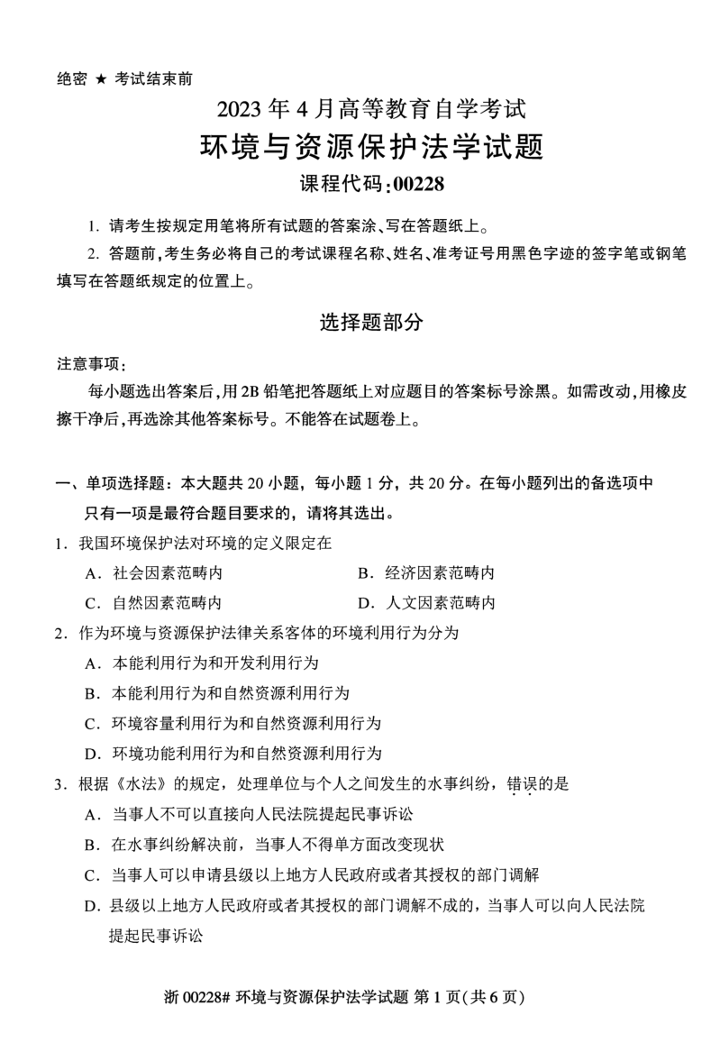 以下是自考资料网为考生们整理了“2023年4月自考00228环境与资源保护法学试题及答案”,同学们可以通过对“2023年4月自考00228环境与资源保护法学试题及答案”的练习,更加从容的面对自考。更多自考历年真题及详细答案解析请关注收藏自考资料网。