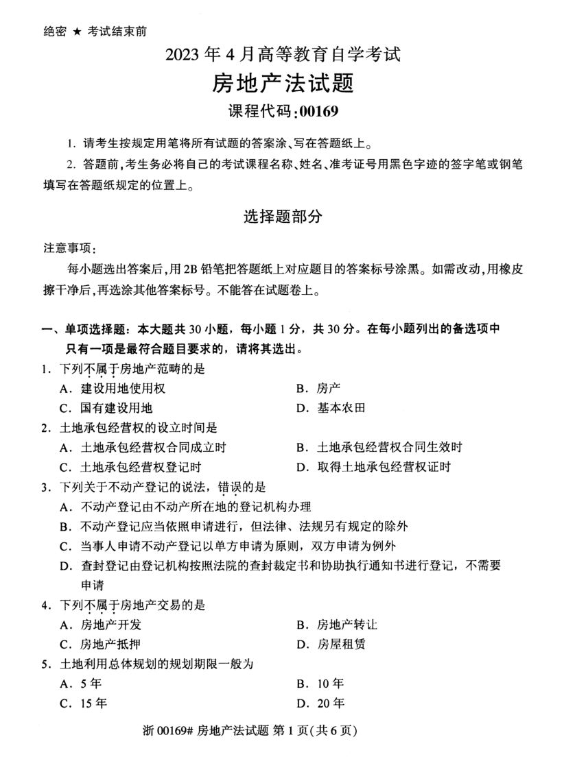 以下是自考资料网为考生们整理了“2023年4月自考00169房地产法试题及答案”,同学们可以通过对“2023年4月自考00169房地产法试题及答案”的练习,更加从容的面对自考。更多自考历年真题及详细答案解析请关注收藏自考资料网。