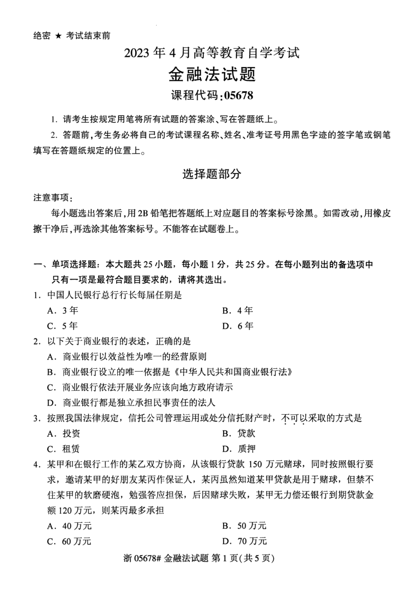 以下是自考资料网为考生们整理了“2023年4月自考05678金融法试题及答案”,同学们可以通过对“2023年4月自考05678金融法试题及答案”的练习,更加从容的面对自考。更多自考历年真题及详细答案解析请关注收藏自考资料网。