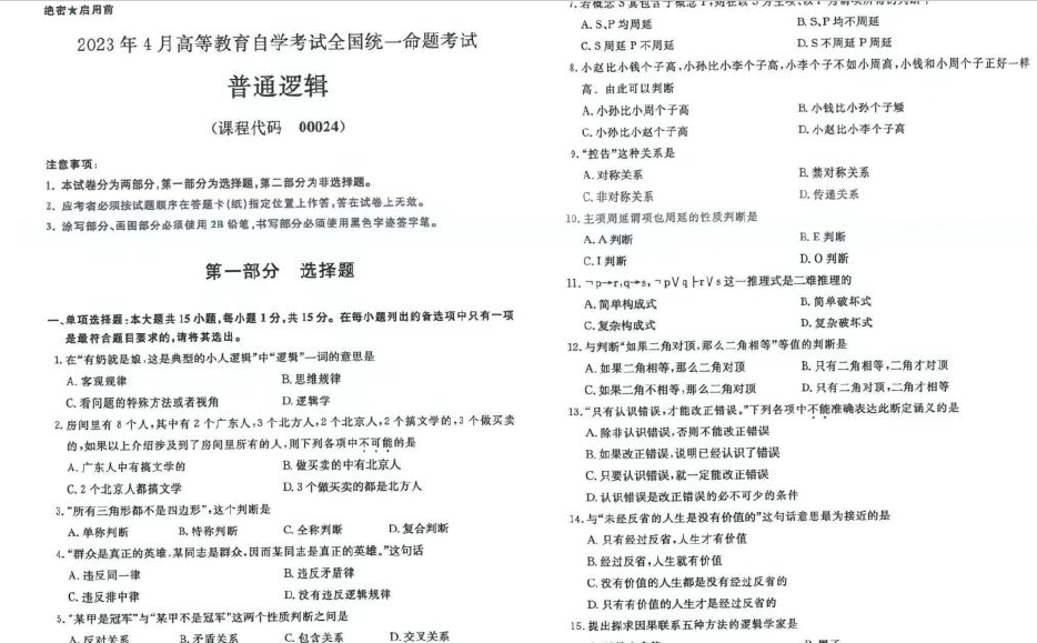 以下是自考资料网为考生们整理了“2023年4月自考00024普通逻辑试题及答案”,同学们可以通过对“2023年4月自考00024普通逻辑试题及答案”的练习,更加从容的面对自考。更多自考历年真题及详细答案解析请关注收藏自考资料网。