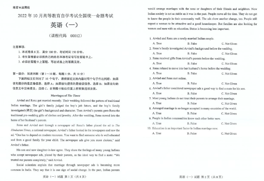 以下是自考资料网为考生们整理了“2022年10月自考00012英语一及试题及答案”,同学们可以通过对“2022年10月自考00012英语一及试题及答案”的练习,更加从容的面对自考。更多自考历年真题及详细答案解析请关注收藏自考资料网。