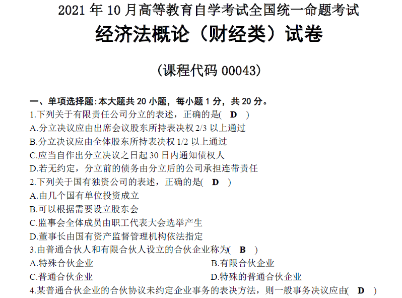 以下是自考资料网为考生们整理了“2021年10月自考00043经济法概论(财经类)试题及答案”,同学们可以通过对“2021年10月自考00043经济法概论(财经类)试题及答案”的练习,更加从容的面对自考。更多自考历年真题及详细答案解析请关注收藏自考资料网。