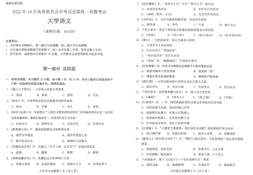 以下是自考资料网为考生们整理了“2022年10月自考04729大学语文试题及答案”,同学们可以通过对“2022年10月自考04729大学语文试题及答案”的练习,更加从容的面对自考。更多自考历年真题及详细答案解析请关注收藏自考资料网。