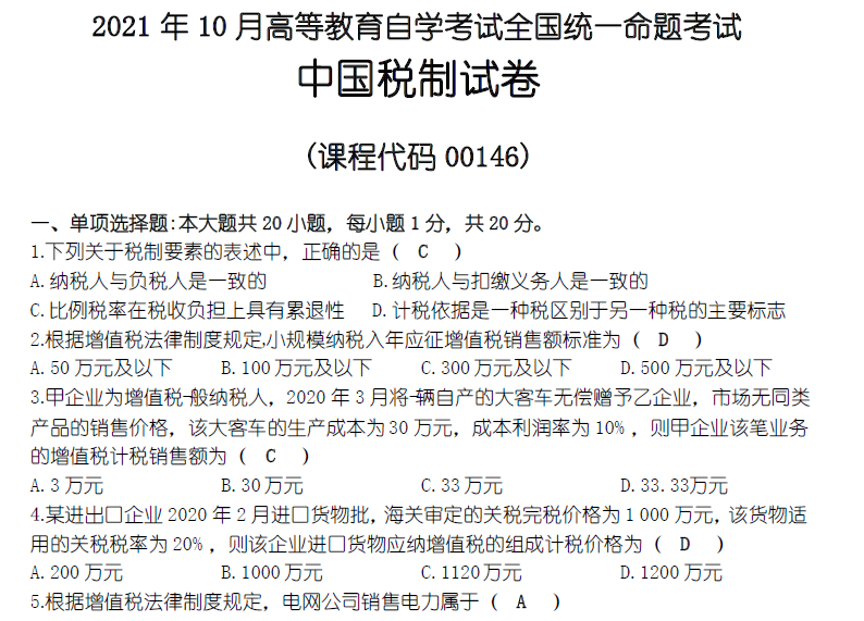 00146中国税制真题合集下载:点我即可,清晰可打印