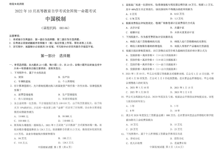 以下是自考资料网为考生们整理了“2022年10月自考00146中国税制试题及答案”,同学们可以通过对“2022年10月自考00146中国税制试题及答案”的练习,更加从容的面对自考。更多自考历年真题及详细答案解析请关注收藏自考资料网。