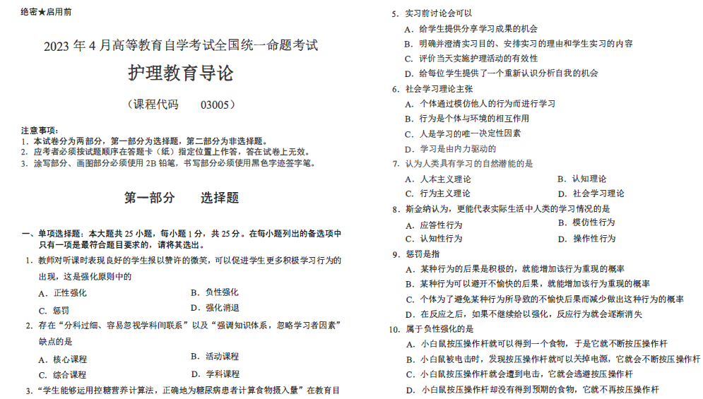 以下是自考资料网为考生们整理了“2023年4月自考03005护理教育导论试题(历年真题)及答案”,同学们可以通过对“2023年4月自考03005护理教育导论试题(历年真题)及答案”的练习,更加从容的面对自考。更多自考历年真题及详细答案解析请关注收藏自考资料网。